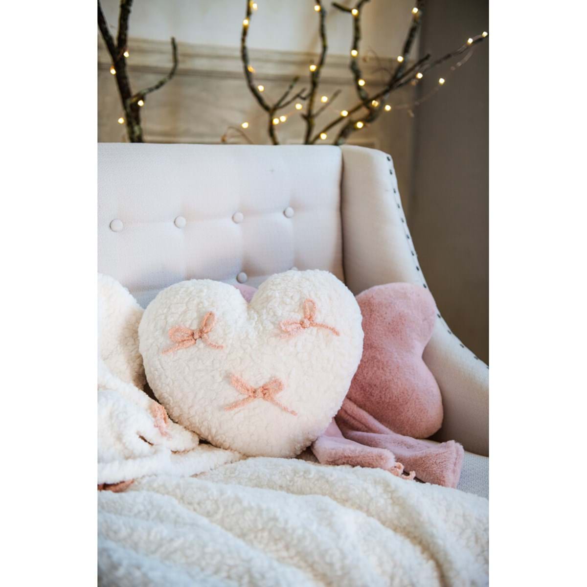 Meraviglioso set composto da plaid e cuscino a forma di cuore, con fiocchetti applicati.